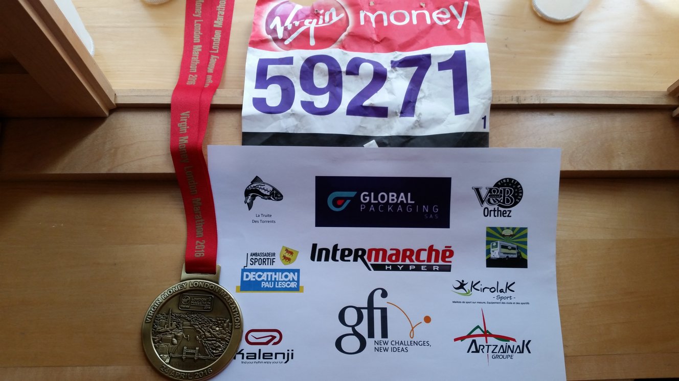 Marine et Estelle m’attendent à la « flamme rouge » au dernier km ! Une ambiance de fou, impressionnant tout ce monde. Je récupère le drapeau basque et me voilà le dernier km, devant Buckingham Palace à courir avec mon drapeau à la main. Les gens apprécient et m’encouragent encore plus ! J’aperçois l’arche d’arrivée, le chrono est parfait, je suis trop bien, trop heureux, je profite à fond, les émotions sont décuplées après 42km ! Rare sont ces moments là !!