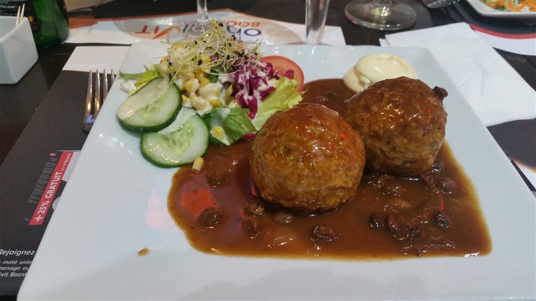 Spécialité de Liège : Le boulet à la liégeoise est une spécialité culinaire traditionnelle de la ville de Liège. Il s’agit d’une ou deux grosses boulettes préparées à base de hachis de viandes de porc et de veau, ou de porc et de bœuf, de mie de pain, d’oignons et de persil, dorées à la poêle, puis cuits à feu doux dans une sauce aigre-douce particulière à base d’oignons, de vinaigre, de cassonade, de sirop de Liège et raisins de Corinthe