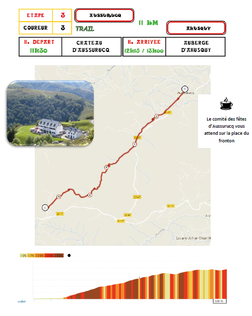 C’est un trail pour le coureur 3, qui part du fronton d’Aussurucq, emprunte une piste et arrive au pied de l’Auberge d’Ahusquy.