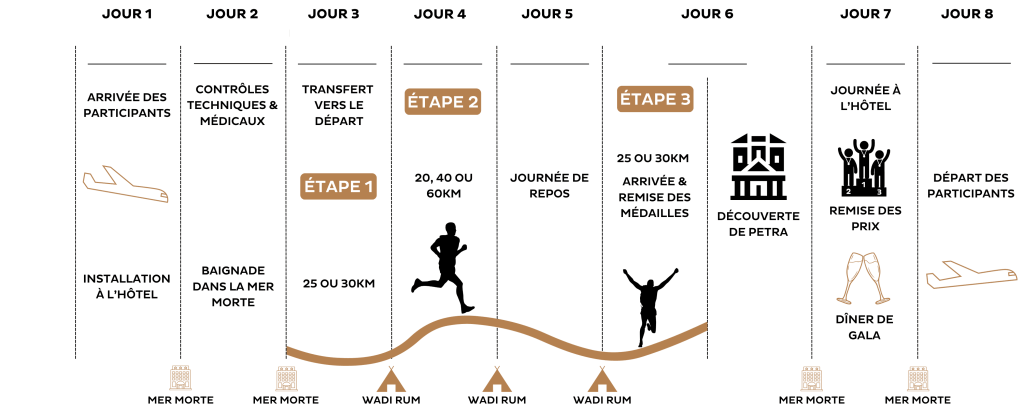 Le programme officiel prévoit une arrivée le samedi à l’aéroport d’Amman, puis une navette jusqu’à l’hôtel. Le dimanche est dédié au contrôle technique et au retrait des dossards, avant un départ très (très !) matinal le lundi à 4 h pour environ cinq heures de bus.