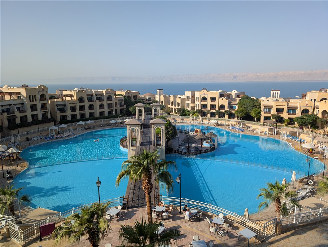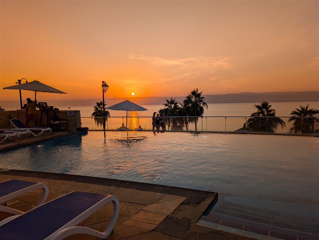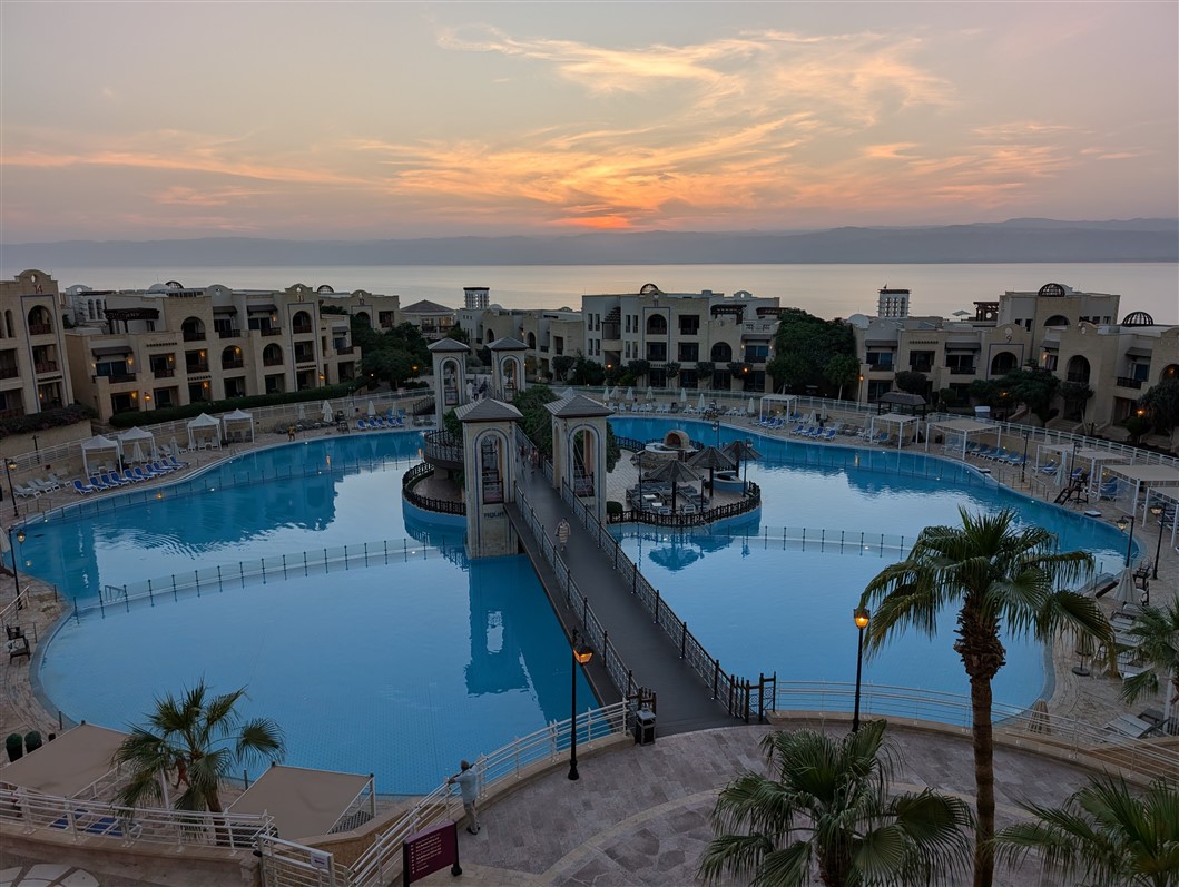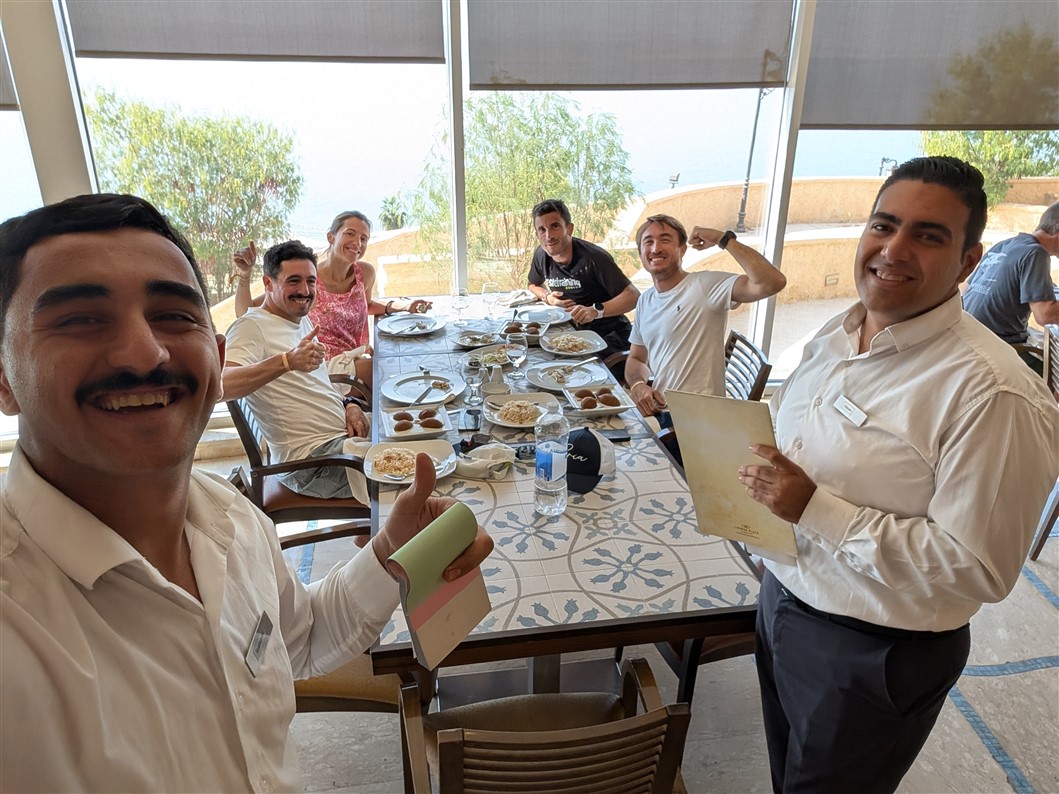 Nous arrivons en pleine nuit, encore un peu groggy par le voyage. Mais au réveil, le samedi matin, le décor nous cloue littéralement sur place. L’immensité de l’hôtel, la piscine majestueuse, la mer Morte en toile de fond, et, au loin, Israël qui se dessine à l’horizon. La matinée s’écoule doucement, entre un long petit-déjeuner, un footing d’acclimatation pour dérouiller les jambes… et un premier plouf bien mérité dans la piscine 🏊♂️✨