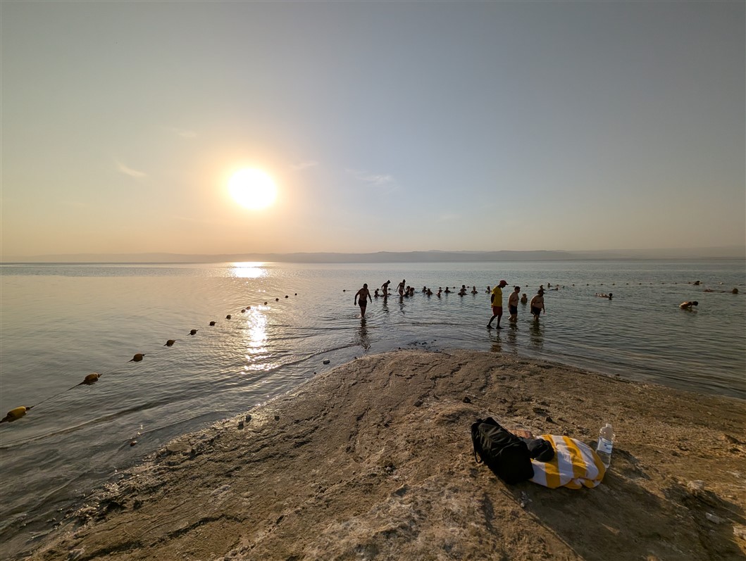 Le moment tant attendu est enfin arrivé. Une question me trottait dans la tête depuis des années : vais-je flotter sur la mer Morte ? Une vraie énigme personnelle, quand on sait que je coule systématiquement en piscine. Et là, énorme surprise… je flotte, vraiment. Sans bouger, sans effort. Un truc de dingue, une sensation totalement folle. La mer Morte est si salée — près de dix fois plus que les océans — que l’eau y est extrêmement dense. Cette salinité exceptionnelle vient du fait qu’aucun fleuve n’en ressort : l’eau s’évapore, le sel reste, encore et encore. Résultat, le corps est littéralement porté à la surface, comme s’il refusait de couler. Me voilà suspendu à la surface du point le plus bas de la Terre, à plus de 400 mètres sous le niveau de la mer.